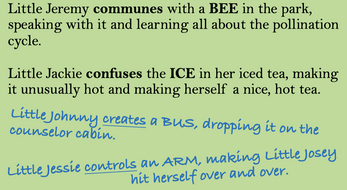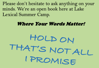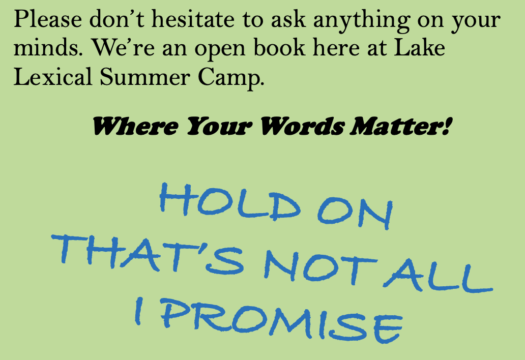 This is a camp handbook for the Lake Lexical Summer Camp, a camp for pre-teens with the ability of Locution - the power to create, control, or otherwise affect anything they can imagine, so long as it's a three-letter word. The handbook guides the parents reading it through what their Campers can expect from structured & supervised experimentation with their Locution powers, while some scrawled messages in the handbook hint at what these messy teens actually get up to at camp.